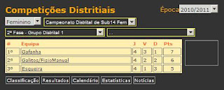 Finalizada a 2ª fase do Campeonato Distrital de Sub14 Femininos - Grupo Distrital 1, a equipa do GD GAFANHA (grupo também composto por muitas minis e iniciadas de 1º ano) conseguiu garantir o 1º lugar do seu grupo, com o consequente apuramento para o Torneio Inter-Associações, objectivo fulcral para a nossa equipa, pois a participação nesta competição ainda abre a porta à possibilidade da nossa equipa estar presente na Fase Final Distrital a realizar-se em Junho de 2011.